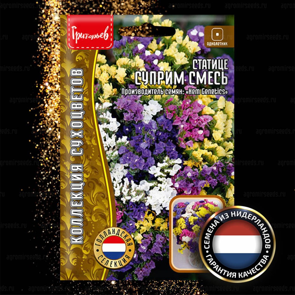 Один из самых популярных сухоцветов, лучший для зимних букетов! Яркий, неувядающий букет служит оригинальным сувениром, а также изысканным украшением любого интерьера. По этой причине миллионы садоводов проводят выращивание статицы у себя на даче. Растение высотой до 75 см. Высушенные цветки долго сохраняют свою окраску. Цветет обильно с июля до заморозков. Используют для цветочных аранжировок, рабаток, миксбордеров.